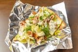 Pie topped with Romaine lettuce, diced fried chicken & topped with a creamy Caesar dressing.